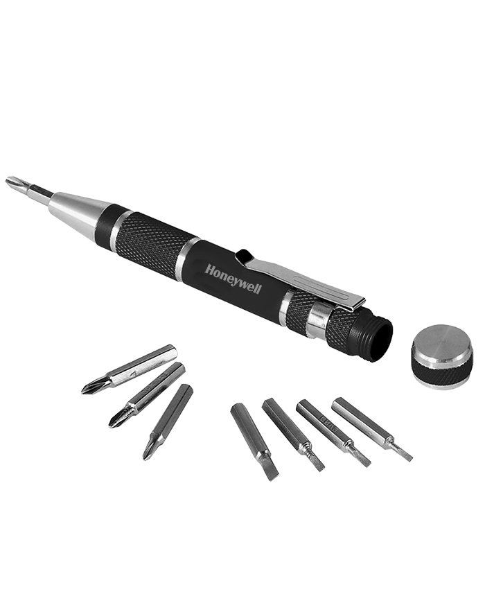 Complete with a clip for easy traveling, this tool features 8 interchangable screwdriver bits (Phillips and Flathead - 4 sizes each) neatly stored inside and kept in place with a screw top lid.